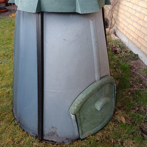 Kompostbeholder i grøn plast. Beholderen er kegleformet med låg foroven og låge forneden til udtagning af kompost.