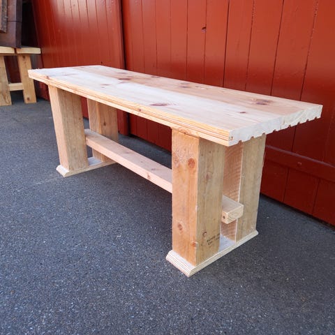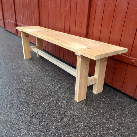 Bænk i træ, velegnet til udendørs brug. Bænken har et enkelt, rustikt design med kraftigt sædebræt og skråstillede ben for stabilitet. Overfladen fremstår slidt med synlige brugsspor og patina, og der kan forekomme begyndende nedbrydning i træet enkelte steder. Egner sig til have, terrasse eller gårdmiljø, eventuelt som projekt til opfriskning eller videre bearbejdning.