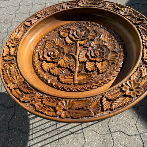 Træfade har rund form med let forhøjet kant og en mørk, mat overflade. Egnet som eller dekorationsgenstand i køkken eller stue.