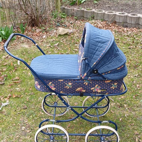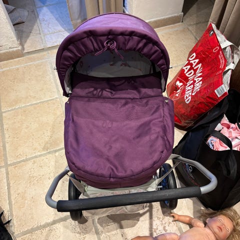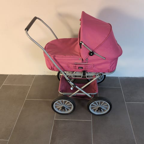 Rød dukkevogn fra Brio og lidt fra Dolce Amora. God brugt men stadig fin til brug. Der er sat lidt tape på lås ved hjul (se billede).