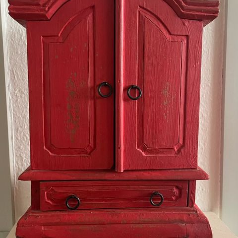 Træskab med glaslåger og skuffer i brun træfinish. Skabet har to låger med små glasfelter og en indvendig hylde til opbevaring. Nederst er der fire skuffer. Egnet til opbevaring af mindre genstande som f.eks. smykker, nips eller andre småting i hjemmet.