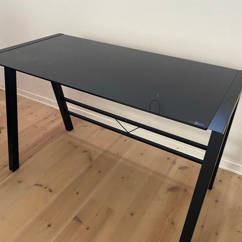 Et flot sort skrivebord med mat glasplade til salg. Bordet er brugt men har ingen synlige fejl.