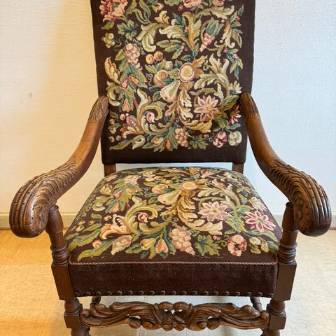 Tronstol, 150 år gl., b: 56 d: 56 h: 104, Meget flot udskåret stol fra 1800 tallet. Flotte udskæringer. Fletværk i ryggen skal udskiftes.