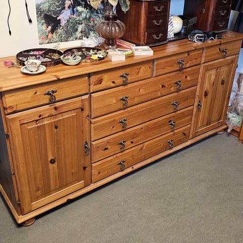 Sælger denne charmerende skænk i massivt fyrretræ. Skænken har masser af opbevaringsplads og vil passe perfekt ind i et køkken, en stue eller en gang, hvor der mangler plads til service, duge eller andet.