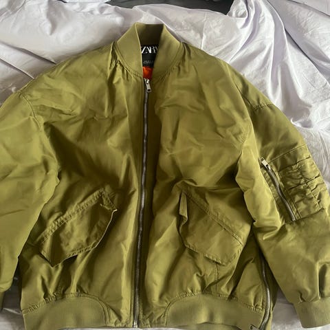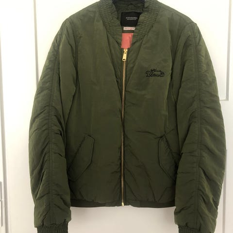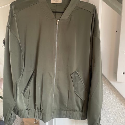 'Bomber jacket'. Jakken er fremstillet i polyester og har en grøn yderside med kontrastfarvet foer. Modellen har ribkant ved krave, ærmer og nederste kant samt lynlåslukning foran. Der er flere lommer, herunder en lynlåslomme på ærmet og sidelommer med trykknapper.
