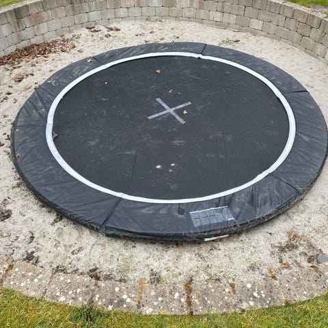 Trampolin til nedgravning - trampolinen er i fin stand, men beskyttelsesringen er et sted blevet flænset op. Kan sikkert repareres. Nypris 5500kr