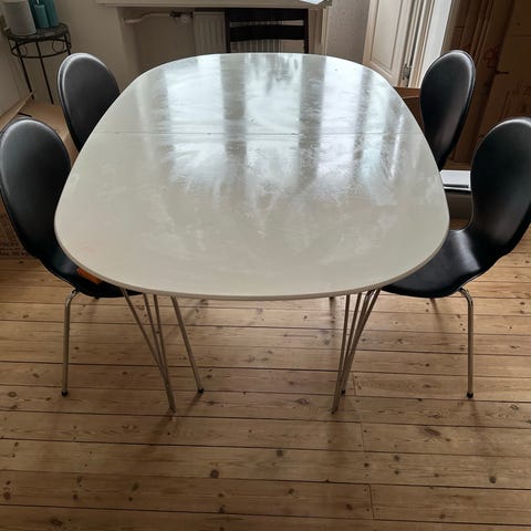 Velholdt spisebordssæt bestående af ovalt spisebord og 6 matchende spisebordsstole. Ovalt 108 cm uden plader, kan udvides til 148 cm og 188 cm i længde med de to ekstra plader.