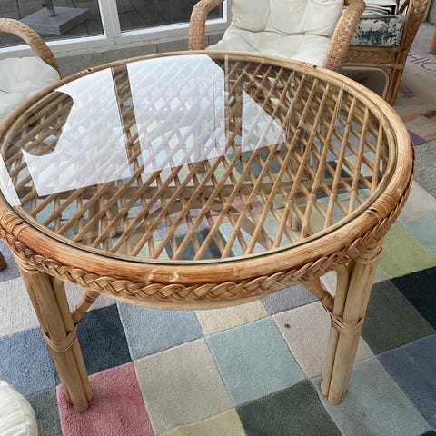 Rundt havebord i træ med metalben og tilhørende stole. Bordpladen består af radiært lagte trælameller i bambus med en rund plade i midten. Stolene har grålakeret metalstel, armlæn med små træplader og sæde/ryg i stribede plastlameller i blå, turkis, grønne og grå nuancer. Sættet er egnet til udendørs brug på terrasse eller i have.