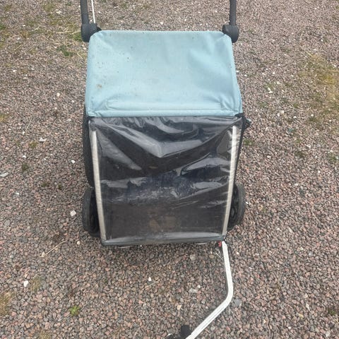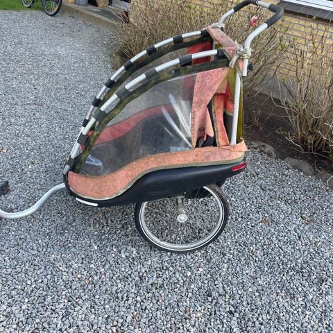 Man kan gå/løbe med den, men den kan også sættes bagpå cykel.