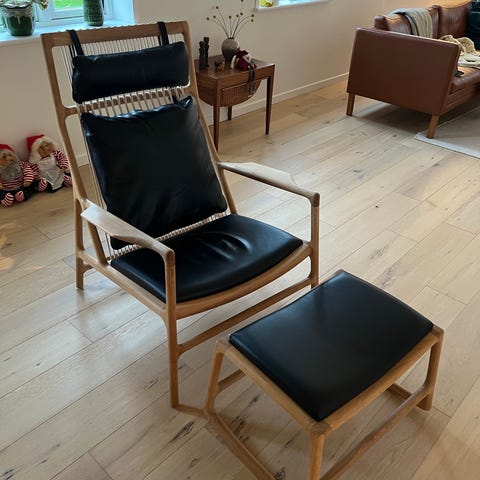 Materialet er massivt sortbejdset eg, elastiske bånd i sædet, fyld i højresistent koldskum med indlagte fiber.