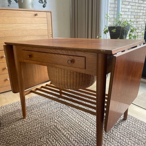 Bordet har de karakteristiske sideflapper (drop-leaf), flettet kurv til garn/sytøj samt en praktisk skuffe med små rum til opbevaring af småting.
