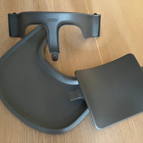 Den er brugt men er i rigtig fin stand og som ny. Den passer til Tripp Trapp børnestol og kan indstilles i to forskellige højder. Der er en sele inkluderet, som kan justeres i længden, og derudover er der en bøjle inkluderes til ophæng af babylegetøj (kan tages af og på efter behov).