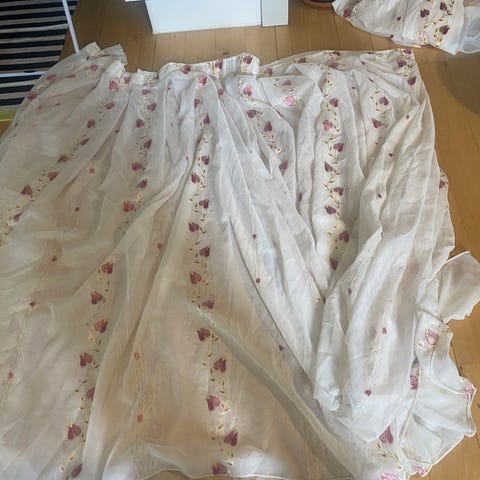 Gardiner: Højde ca. 130 cm. Bredde forneden ca. 120. 2 stk gardiner.