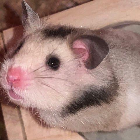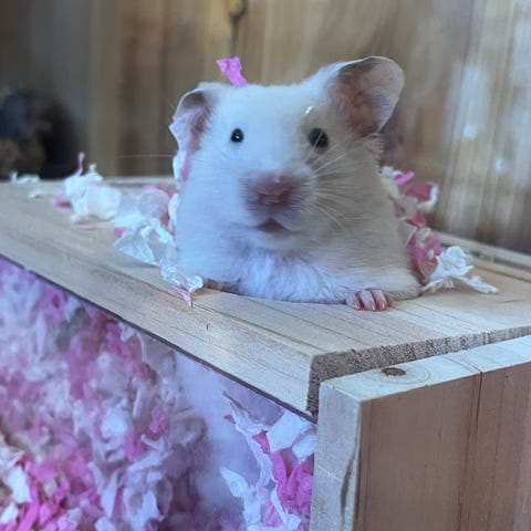 Hils på Katinka! Den sødeste guldhamster pige på 7 måneder. Hun er fuldstændig håndtam og kravler selv om i hånden. Faktisk kan hun blive siddende længe i ens hånd i håbet om at blive taget op på eventyr- også selvom hun lige har været oppe. Hun er købt ved opdrættet og er top sund. Hun ligner en mini pels panda og har samme appetit, hvilket man også godt kan se på hendes taljemål 😍 Hun har den mest silkebløde halvlange pels og kræver ingen pelspleje.