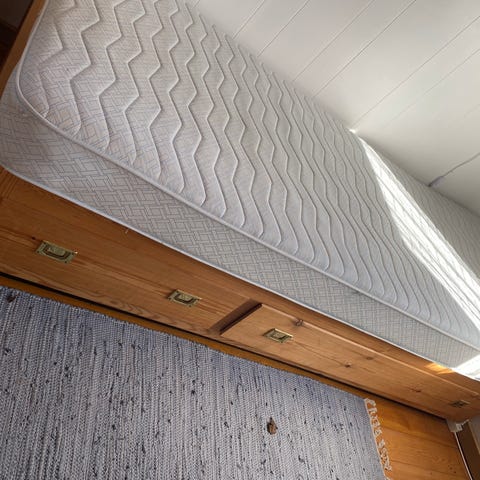Er blevet brugt som seng, og der kan derfor medfølge en rullemadras og en tynd topmadras hvis det ønskes.