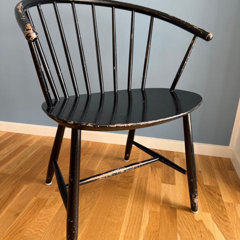 Original stol, købt som egetræ ved antikvitetshandler. Finer restaureret ved snedker.