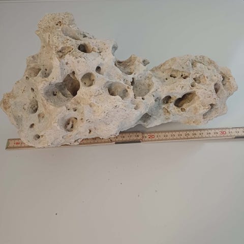 Stor flot kalksten med huller brugt i cichlide akvarie.