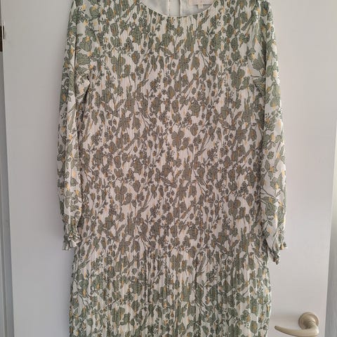 kjole til særlige lejligheder i beige polyester og one size. Kjolen er lang med løs, draperet overdel og dyb v-udskæring foran. Den har markeret talje med aftageligt bindebælte i samme materiale og let plisseret nederdel, der falder løst. Ærmeløs model med brede skulderstropper og åben armudskæring. Velegnet som fest- eller occasionkjole.