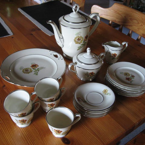Bing & Grøndahl Klitrose kaffestel i porcelæn med blomsterdekoration. Sættet omfatter blandt andet kaffekande, sukkerskål, flødekande, kopper med hank, desserttallerkner + 1 kagefad