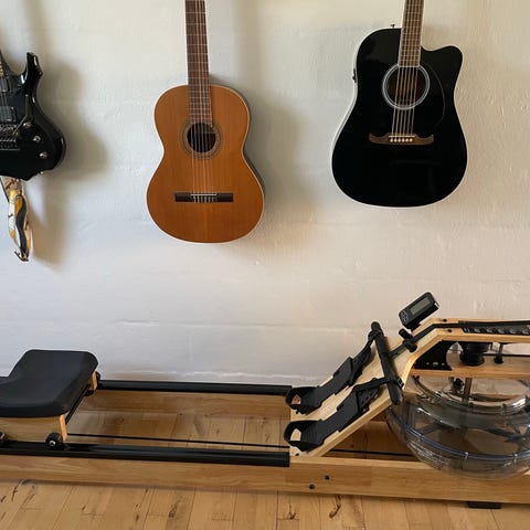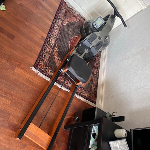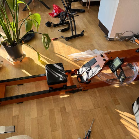 Maskinen har sæde på skinne, håndtag med frontenhed samt vandtank som modstandssystem.