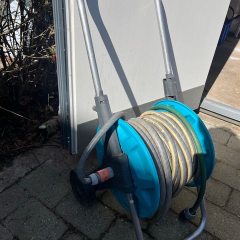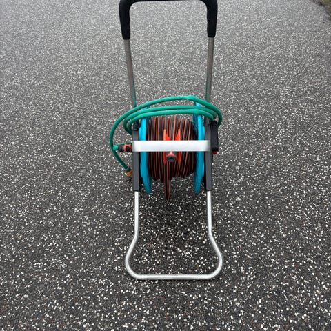 Gardena Slangevogn inkl. 15 meter slange, indv. koblinger og easy oprul. Indstillelig højde. Plus helt ny hazelock dysse.