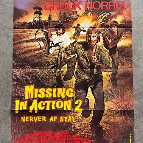 Missing in Action filmplakat. Original plakat med motiv fra actionfilmen, trykt på papir og egnet til indramning eller ophængning som vægdekoration.str 62/83 orginal Filmplakat
