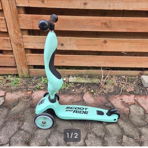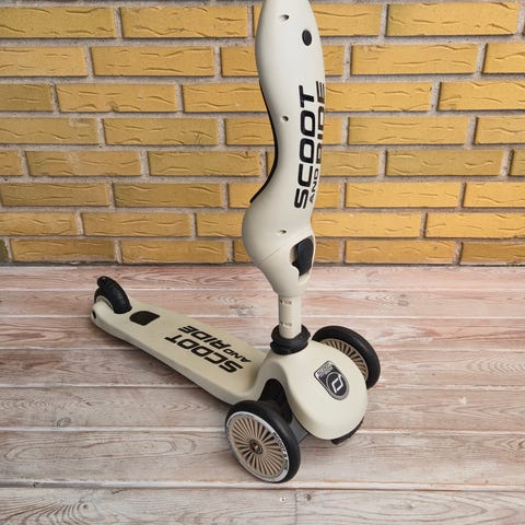 Scoot & Ride Highwaykick løbehjul i blå. Løbehjulet har tre hjul med to hjul foran for øget stabilitet og et enkelt hjul bagtil. Styret er højdejusterbart, og der er fodplade med skridsikkert mønster. Egnet til mindre børn, som ønsker et stabilt løbehjul til kørsel på jævne underlag som fx fliser og asfalt.