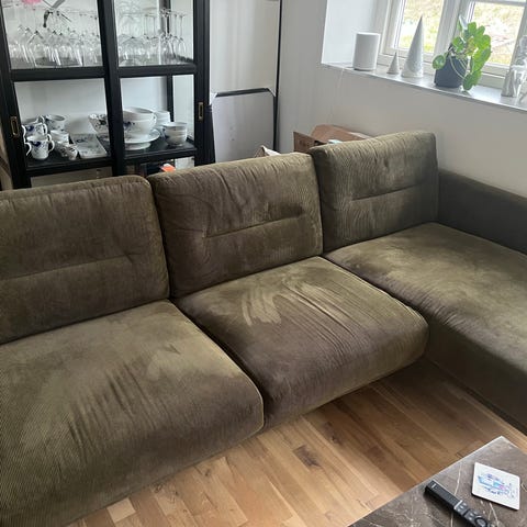 Fremstå i pæn stand - men med brugstegn/ pletter på stoffet på begge sofaer.