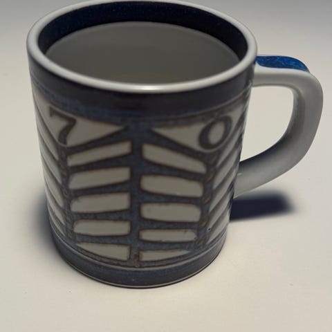 Royal Copenhagen fajance krus med årstallene 1775 og 1975 samt kronemotiv og bølgesymbol. Kruset er i hvid fajance med blå og sorte dekorationer og har hank. Velegnet som kop eller samlerobjekt fra Royal Copenhagen.