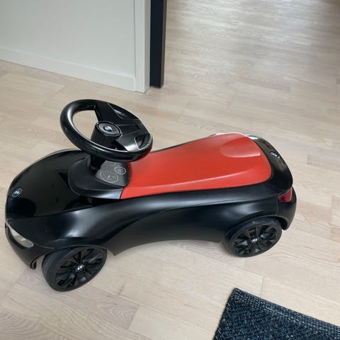 løbecar i rød plast. Bilen har fire hjul og et hvidt rat med rød knap. Den er fremstillet i hård plast og er egnet som køretøj til mindre børn, der kan skubbe sig frem med benene. Velegnet til brug indendørs eller på jævne udendørs underlag.