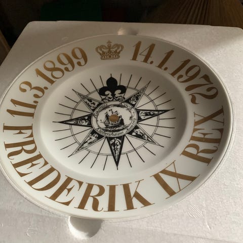 Bing & Grøndahl mindetallerken i porcelæn med motiv for Frederik IX. Tallerkenen er hvid med guldfarvet skrift langs kanten og sort kompas- og skibsmotiv i midten. Der er trykt datoer og kongelig krone på forsiden. Bagsiden har påskrift om mindeudgivelsen samt ophængsanordning, så tallerkenen kan hænges på væggen. Egnet som samlerobjekt eller dekoration.