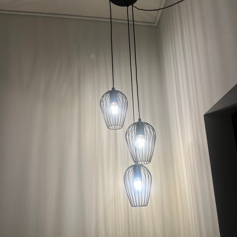 Unik Aqua creation 3 palm loftslampe til salg. Silkebeklædt lampe i farve lys creme og mørkebrunt stativ