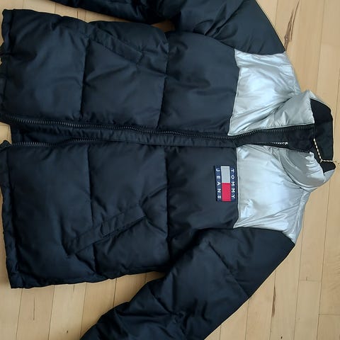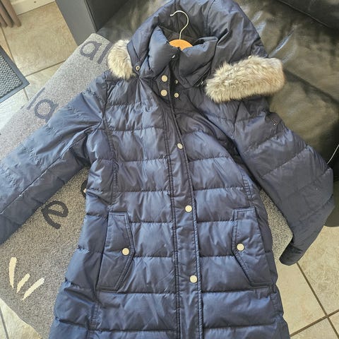 Tommy Hilfiger dunjakke til kvinder i størrelse M. Lang, quiltet model i blå med hætte og aftagelig eller fastsyet kunstpelskant (ud fra billederne). Jakken er fyldt med dun, hvilket giver god isolering. Foran er der gennemgående lukning med trykknapper og lynlås samt forlommer med klap. Ærmet har rund Tommy Hilfiger-logoapplikation. Velegnet som varm overtøjsjakke i de kolde måneder.