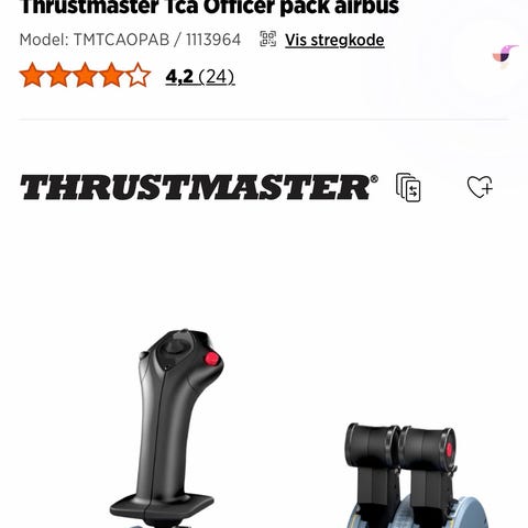 Thrustmaster Hotas Warthog joystick og throttle controller til pc. Sættet består af en separat joystick-enhed og en separat throttle-enhed, forbundet via kabler. Joysticket er monteret på en tung base med flere knapper og hat-switch på selve stikken. Throttle-enheden har dobbelt gashåndtag, flere vippekontakter, knapper og drejehjul på frontpladen. Produktet er designet til flysimulatorbrug på pc og giver mulighed for præcis styring af flyfunktioner gennem de mange programmerbare knapper og akser. Enhederne tilsluttes med kabel. Egnet til brug sammen med forskellige fly- og rumsimulatorer, hvor der ønskes separat styring af joystick og throttle.