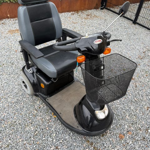 El-scooter med 3 hjul i sølvfarve med sort polstret sæde og ryglæn. Sædet har armlæn og nakkestøtte samt mulighed for at dreje for nem ind- og udstigning. Scooteren har bund med skridsikker overflade, kurv foran til opbevaring og spejl på styret. Betjeningspanelet på styret har tydelige knapper og indikatorer til styring af hastighed, lys og øvrige funktioner. Velegnet som mobilitetshjælpemiddel til kørsel på fortov og jævne underlag.