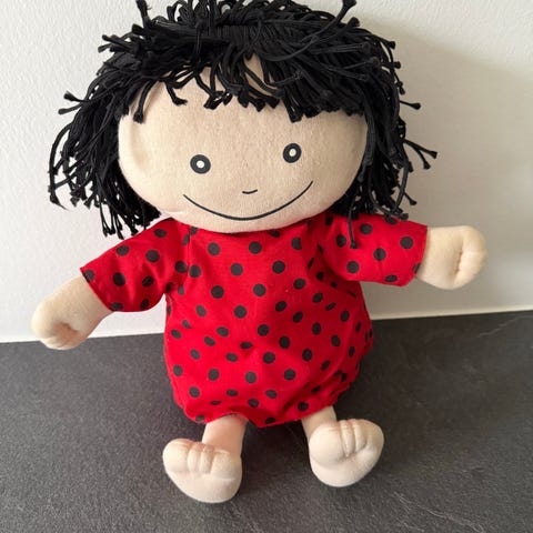 Rubens Barn bamse dukke med blød krop og påsyet tøj. Dukken har sort hår og er iført en kjole i pink og brun med lomme foran. Materialet er blødt stof, og dukken er designet som en blød krammedukke til børn.