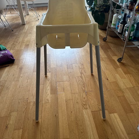 IKEA højstol i hvid plast med metalben. Sædet er formstøbt og har åbning til montering af sikkerhedssele (sele medfølger ikke ud fra billederne). Stolen er egnet til mindre børn, som kan sidde selv, og kan bruges ved spisebord eller andre borde med passende højde. Overfladen er glat og kan tørres af med en fugtig klud. Benene er aftagelige, hvilket gør stolen nem at opbevare eller transportere.