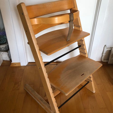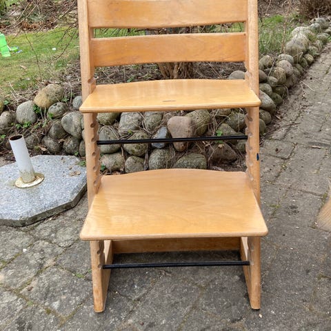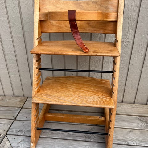 højstol i træ. Klassisk model med justerbar siddeplade og fodplade, der kan tilpasses barnets højde. Egnet til brug ved spisebord eller som siddemøbel til børn. Overfladen viser tydelige brugsspor på sæde og fodplade.