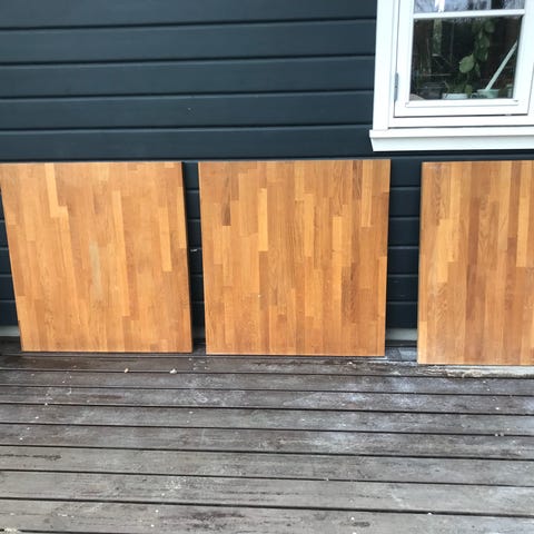 IKEA træplader til køkkenbord. Sættet består af flere massive træplader i rektangulære mål, velegnet som bordplader, hylder eller andre gør-det-selv møbelprojekter. Pladerne fremstår i lakeret træ med synlige samlinger og udskæringer enkelte steder. Egnede til genbrug i indretning eller som reservedele til eksisterende IKEA-møbler, hvor mål og udskæringer passer.