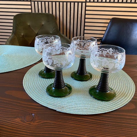 Fransk vinglas i klart glas med grøn fod. Glassene har indgraveret drue- og bladranke langs kanten. Alle glas er 100% i orden. 14 cm højt, 8 cm bredt.