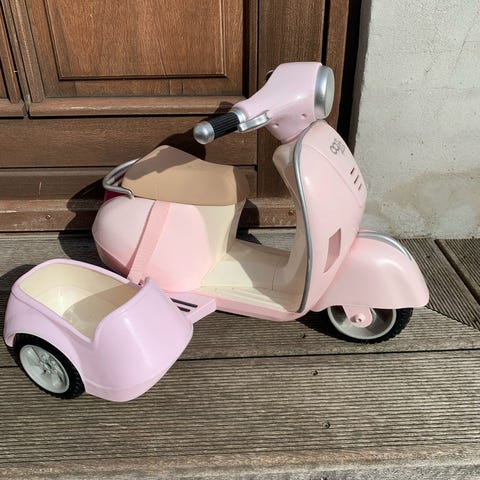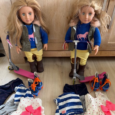 Dukke med tøj , rulleskøjter og løbehjul 100 kr