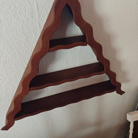 Træreol/væghylde med seks trekantede rum. Reolen er udført i lyst træ og kan hænges på væggen eller stilles op ad en flade. Egnet til opbevaring og udstilling af mindre genstande som dekoration, nips eller små flasker. Geometrisk design med faste skillevægge, der danner de trekantede rum.