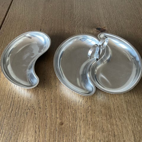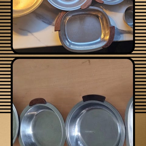 Sælger en samling af retro serveringsfade og skåle i rustfrit stål.