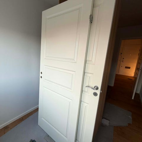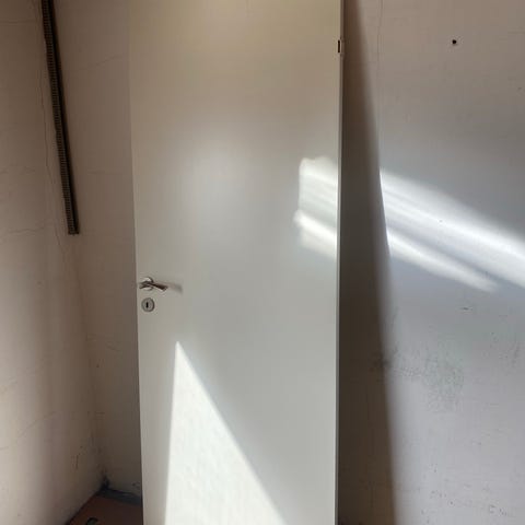 Indvendig dør i hvid overflade. Døren er udstyret med dørgreb og nøglehul/lås. Egnet som almindelig indvendig dør i bolig, fx til værelse, kontor eller gang. Materiale og præcise mål er ikke oplyst.