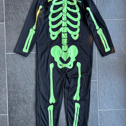 VRS børnekostume i multifarvet polyester til unisex, str. 134. Dragten har skeletmotiv på for- og bagside samt matchende hætte med kranieprint. Kostumet er fremstillet i let polyesterstof, der er egnet til udklædning ved fx fastelavn, halloween eller andre temalege. Lukning bagpå for nem af- og påklædning. Passer typisk til børn omkring størrelse 134. Fra dyr og røgfrit hjem.