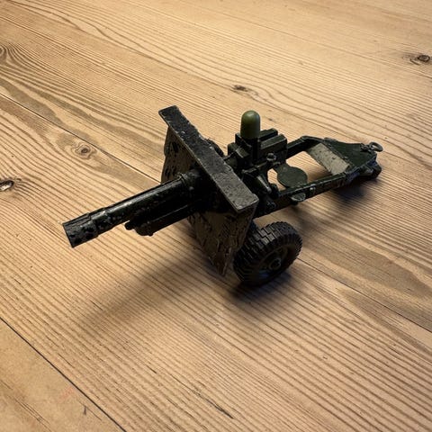 Legetøjskanon i metal i grøn farve. Modellen har to hjul og kan trækkes eller stilles op som feltkanon. Overfladen viser brugsspor og afskalning i malingen. Egnet som samlerobjekt eller som del af en legetøjssoldat- eller militærsamling. Løbet kan justeres op/ned og skydemekanismen er god. Triller godt. Du er velkommen til at komme forbi Islands Brygge og afhente, hvis du vil spare fragten.