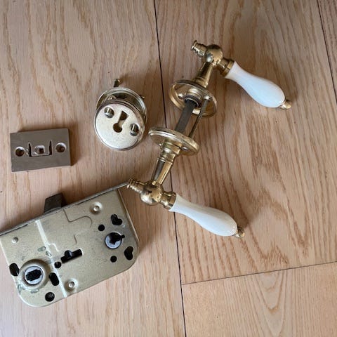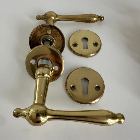 Dørhåndtag / dørgreb messing belagt med hvidt træstykke til indvendige døre.