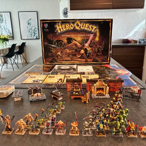 Hasbro HeroQuest Game System brætspil. Klassisk fantasy dungeon crawler, hvor spillerne styrer heltefigurer på en spilleplade med forskellige missioner og scenarier. Spillet indeholder spilleplade, spillefigurer, møbler og terrænelementer i plast, kort, karakterark og diverse markører. Egnet til flere spillere og beregnet til bordspil med eventyr- og rollespilselementer.