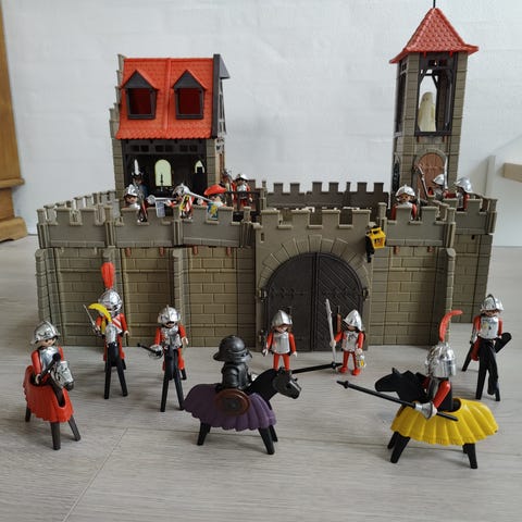 SÆLGES SAMLET for mine to børn - det er dem der får pengene så tænk over det inden bud 🫶🏼Playmobil 2 ridderborge med flere figurer og tilbehør. Sættet indeholder en borg med porte, tårne og indre gård samt forskellige ridderfigurer i rustninger. Der medfølger blandt andet riddere til fods og til hest, våben, skjolde, faner, katapult og mindre tilbehørsdele. Borgen kan bruges til leg med middelalder- og riddertema og kan kombineres med andre Playmobil-sæt i samme serie.