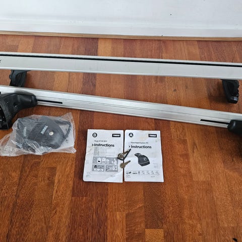 Thule Tagbøjler. Sættet består af to tværstænger med justerbare fødder/beslag til montering på bilens tag. Bøjlerne er velegnede som base til montering af f.eks. tagboks eller cykelholder. Materiale fremstår som metalstænger med plastfødder. Mål fremgår delvist af billederne med tommestok for længdeangivelse.